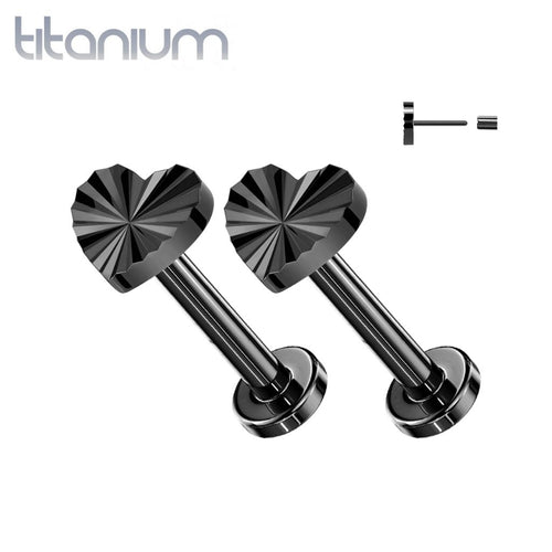 Pair of Implant Grade Titanium Black PVD Dainty Ridged Heart Threadless Push In Earrings With Flat Back