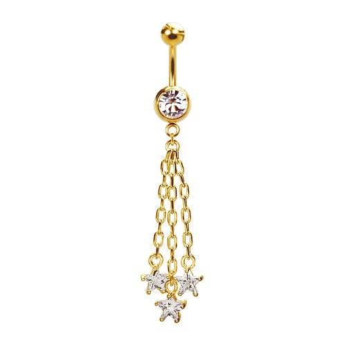 316L Surgical Steel Gold PVD Hanging Chain Triple Star CZ Dangle Belly Ring