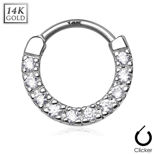 14KT White Gold White CZ Pave Hinged Clicker Nose Hoop