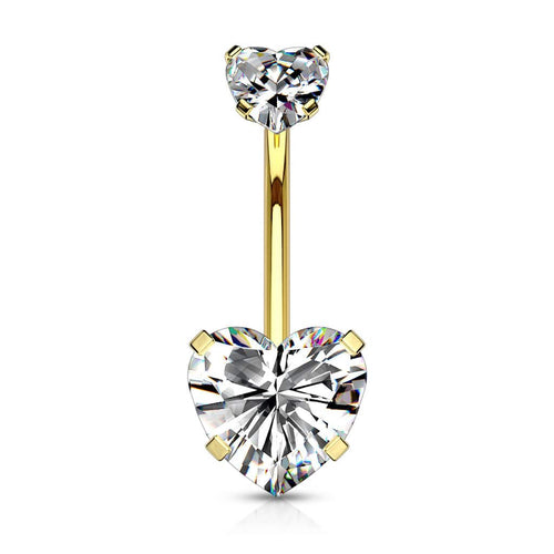 Gold Plated Surgical Steel Double Heart White CZ Gem Belly Button Ring