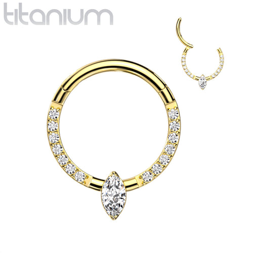 Implant Grade Titanium Gold PVD Pave White CZ Marquise Gem Hinged Clicker Hoop