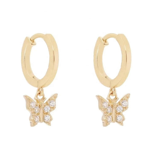 Pair of 925 Sterling Silver Gold PVD Diamond CZ Butterfly Dangle Minimal Hoop Earrings