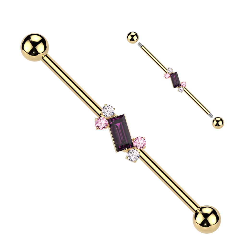 316L Surgical Steel Gold PVD Purple Baguette White & Pink Gem Cluster Industrial Barbell