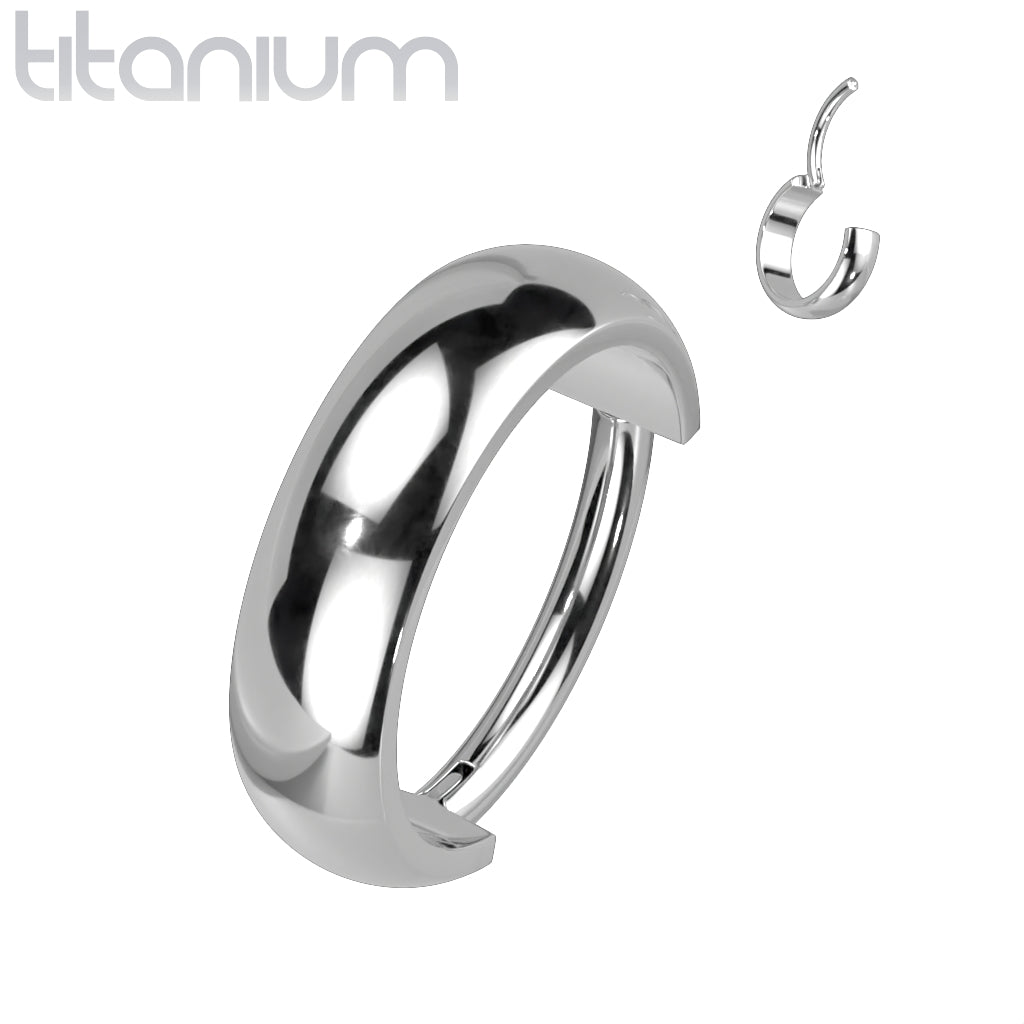 This high polished clicker is made of Implant Grade Titanium. It has a hinged clicker so it can easily be taken off and on. It comes in 16ga in both 8mm and 10mm diameters and can be used for cartilage piercings.