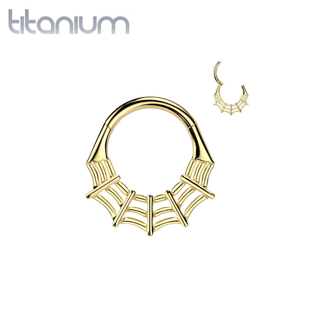 Ideal for septum piercings, this Implant Grade Titanium Spider Web Hinged Clicker Hoop features a flared spider web design. Perfect for spooky season or every day wear!