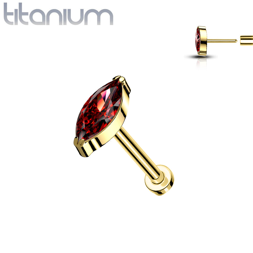 Implant Grade Titanium Gold PVD Threadless Push In Labret Red Marquise CZ Stud