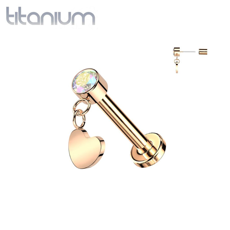 Implant Grade Titanium Rose Gold PVD AB CZ Heart Dangle Threadless Push In Labret