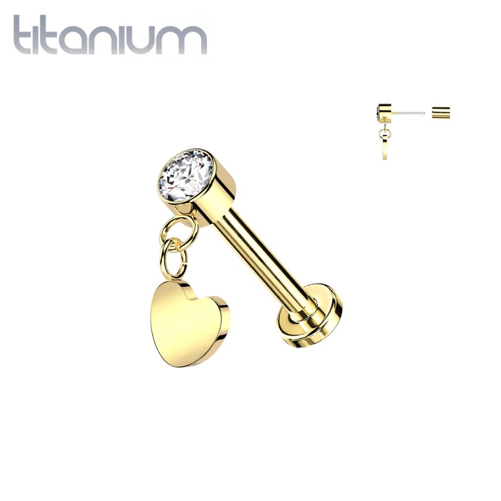 This Threadless Implant Grade Titanium Labret is perfect for any piercing. It has a Threadless White Cubic Zirconia cz heart dangle top. It also comes in a variety of bar lengths. These are easy to put in and secure so it doesn't fall out.