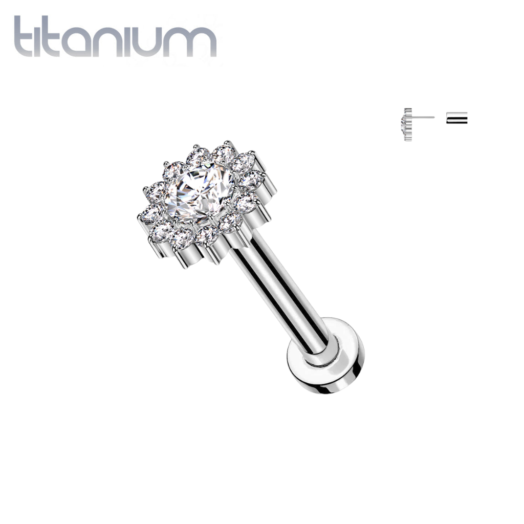 This Threadless Implant Grade Titanium Labret is perfect for any piercing. It has a Threadless CZ Sunflower top. It also comes in a variety of bar lengths. These are easy to put in and secure so it doesn't fall out.