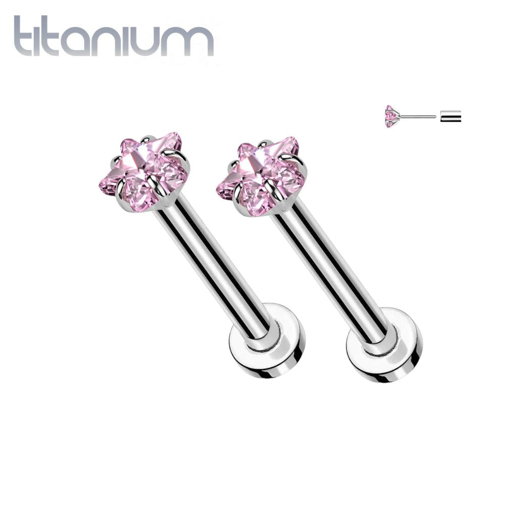 Implant Grade Titanium Threadless Pink CZ Star Shaped Gem Push In Labret With Flat Back - Pierced Universe