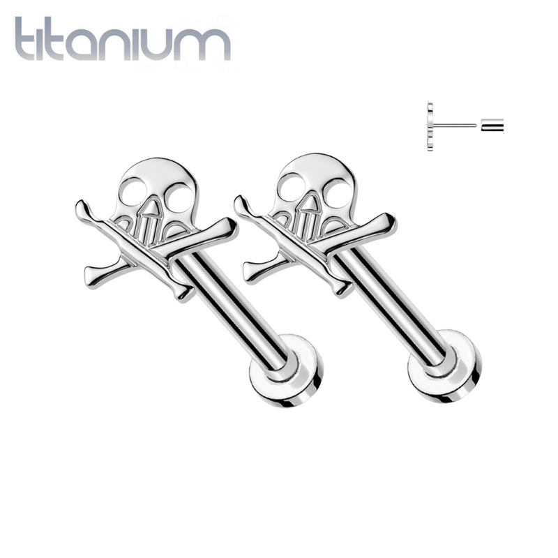 Pair of Implant Grade Titanium Skull and Crossbones Push In Threadless Earrings With Flat Back
