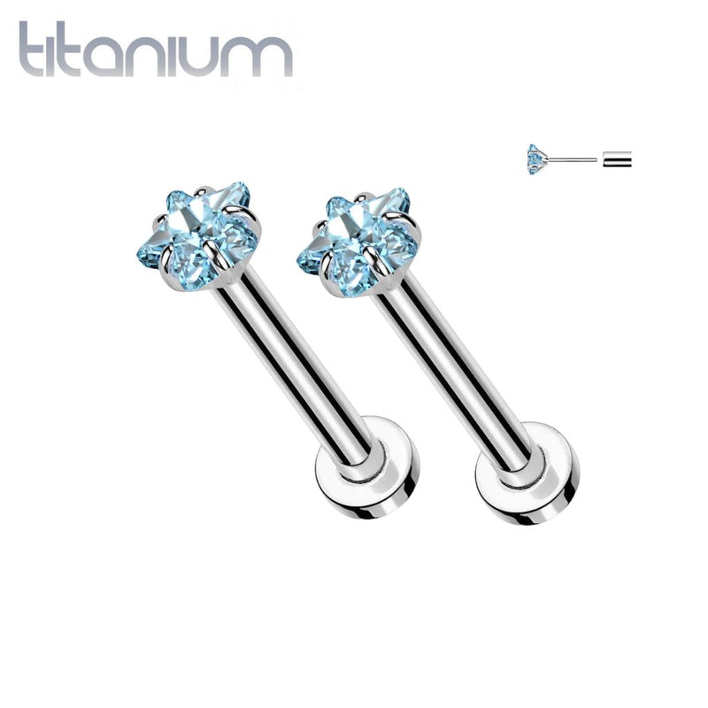 Pair of Implant Grade Titanium Small Dainty Aqua CZ Star Push In Earrings With Flat Back