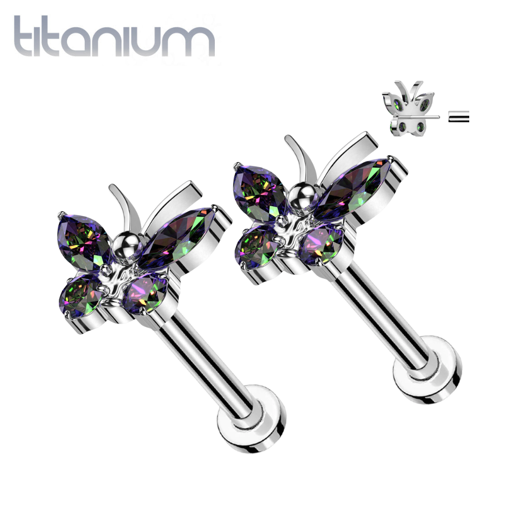 Pair of Implant Grade Titanium Vitrail Medium CZ Large Butterfly Threadless Push In Earrings With Flat Back